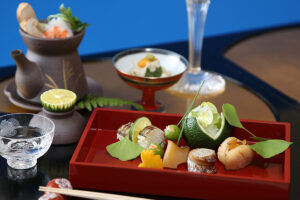 一、黒ミル貝 分葱 酢味噌 一、椎茸 蓮根 もみじ和え 一、千枚かぶら生ハム巻き 一、帆立山椒焼き 芋鮓茶巾 |